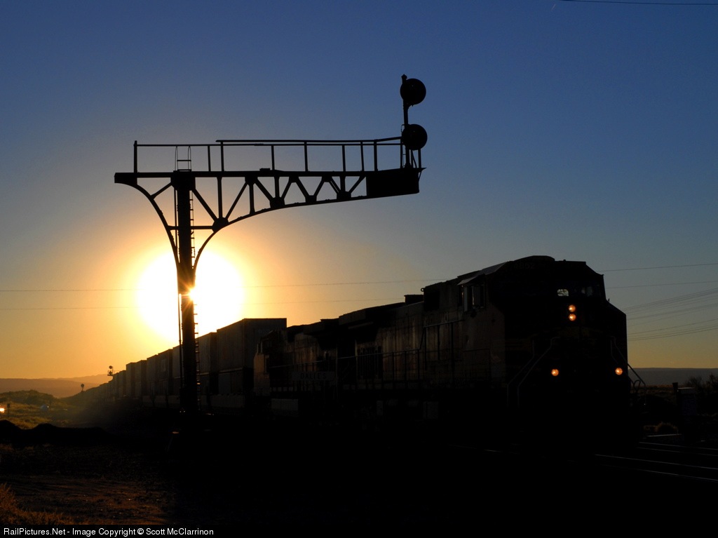The setting sun creates a wonderful silhouette of the signals on BNSF's Transcon main.