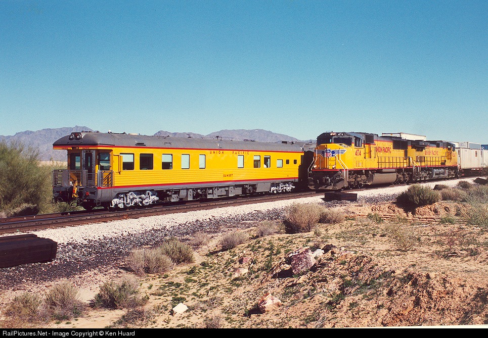 Two UP business cars at the end of a stacktrain on an inspection tour as a Z train passes on the main.