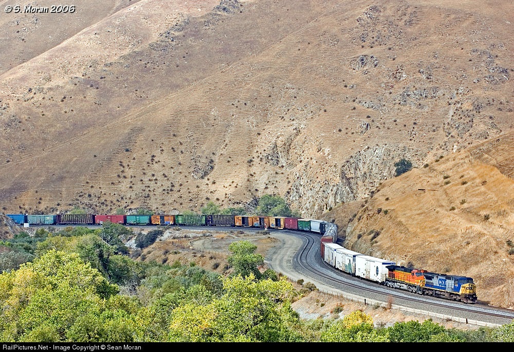 Dwarfed by the hills rising above Caliente, this BNSF manifest is descending into the southern end of the Narrows. It will soon be in the relatively flat Central Valley.