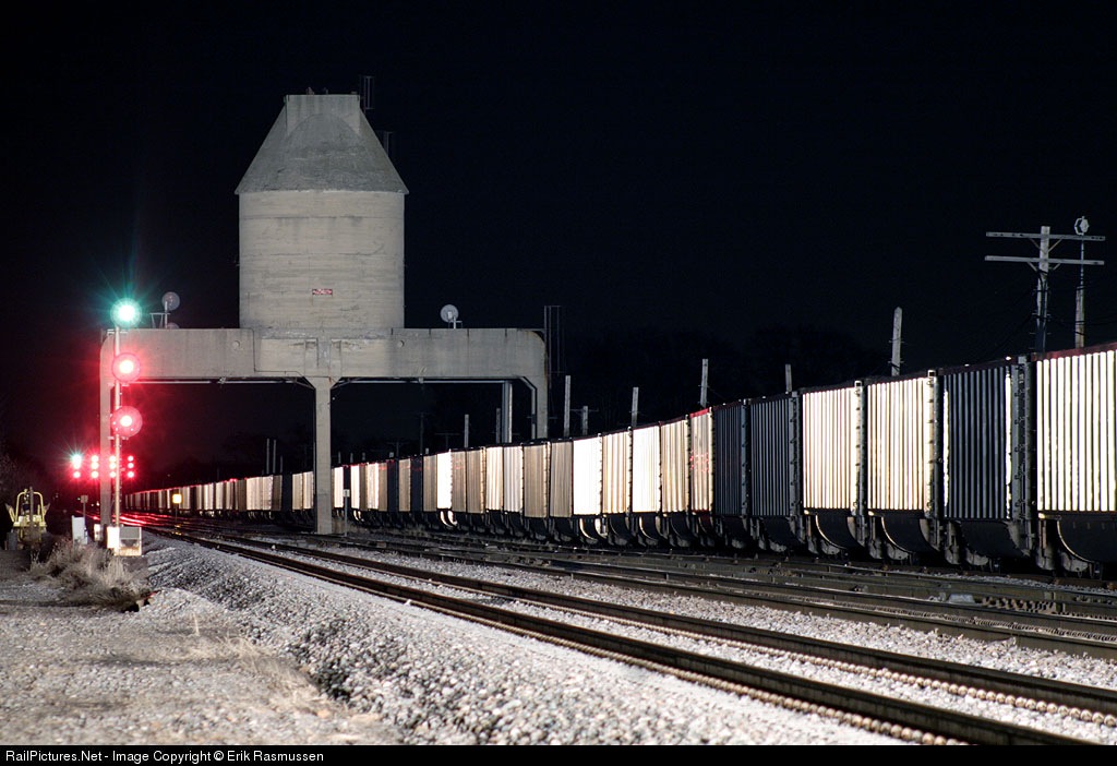 An eastbound stack train lights up the CNW coal chute at Nelson. The coal hoppers on the right are being stored and the signals in the distance are at the CP NQ crossovers.