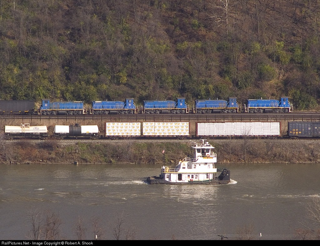 A 5-pak of URR MP15DC's race a tug up the Mon River.