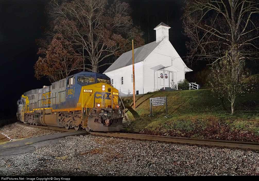 CSX 692 leads a southbound loaded coal drag past the Baptist Church in Huntdale at 04:23. Special thanks to Chris Starnes for guide services.