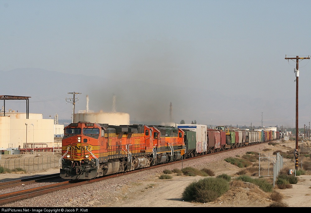 | BNSF C44-9W 5418 leads a Westbound manifest out of Bakersfield. The background shows the industry of which put Kern County on the map, Oil. Also seen behind all the haze is the silohette of Mt. Breckenridge. |