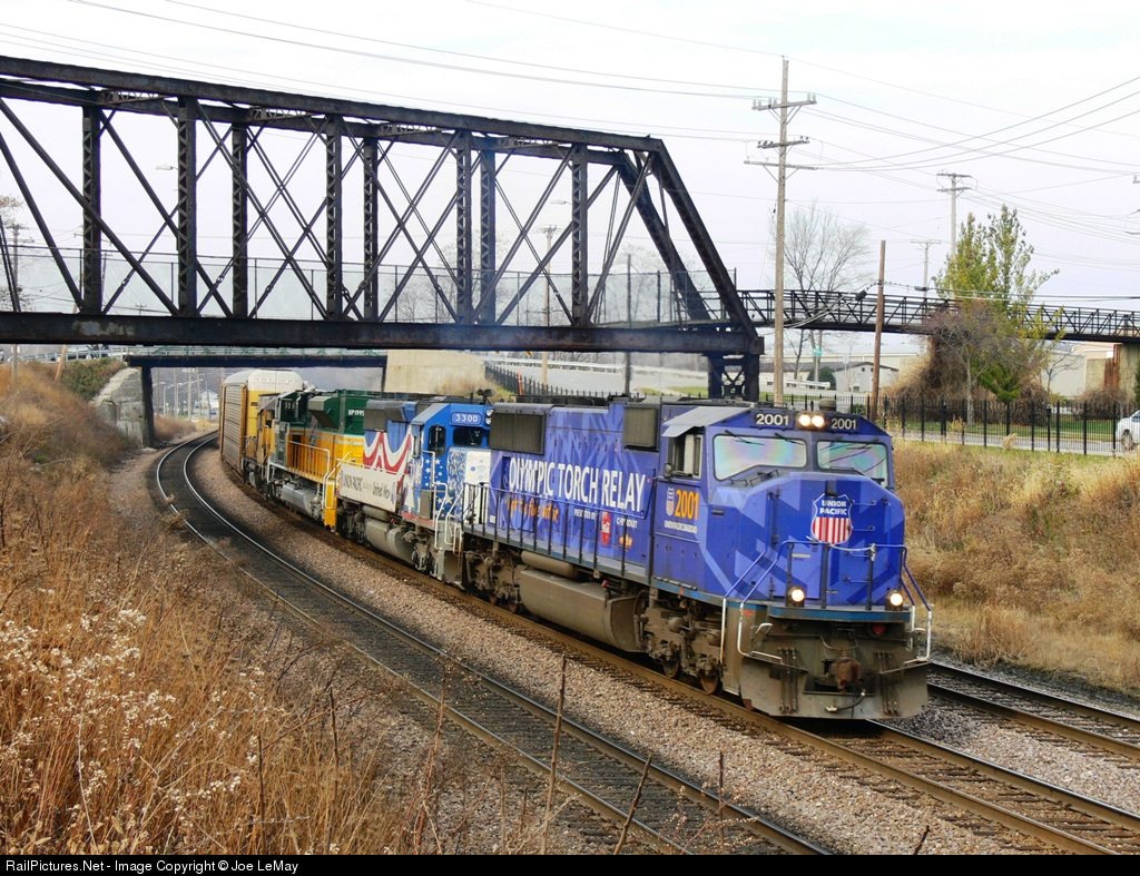 | UP 2001, 3300, and 1995 accelerate out of the holding point in Wheaton. The bridge was once a railroad bridge but now carries a bike path. |