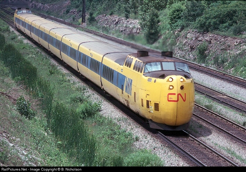 Still under CN control, an eastbound Turbo swooshes under the bridge at Norman St in 1977. Via rail had not yet officially started running Canada's passenger trains, hence the red 'CN' on the nose. The turbos were powered by United Aircraft (now Pratt & W