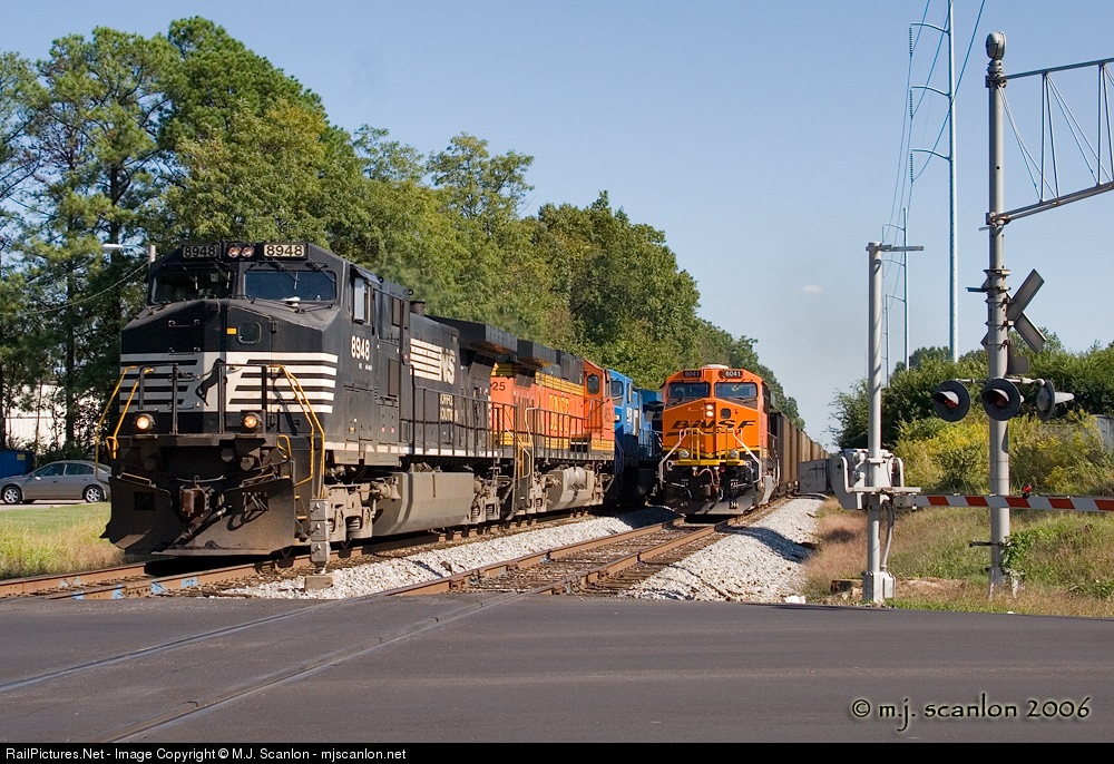 A pair of empty coal trains are seen here at White Siding. NS 8948 heads west on the main towards Forrest Yard while BNSF 6041 waits in the hole.