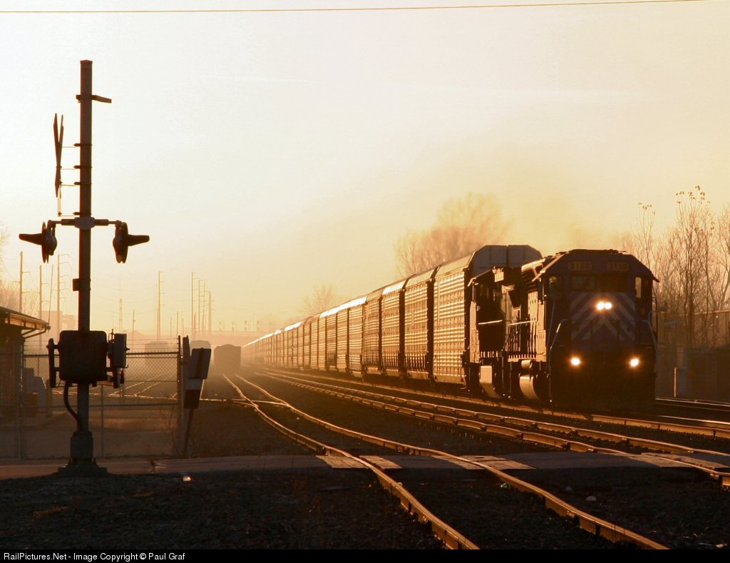 A late afternoon eastbound autorack train emerges from the fog and setting sun on Black Friday. The fog was so dense at one point in the afternoon that an engineer advised the dispatcher that visibility was only about 300 feet!
