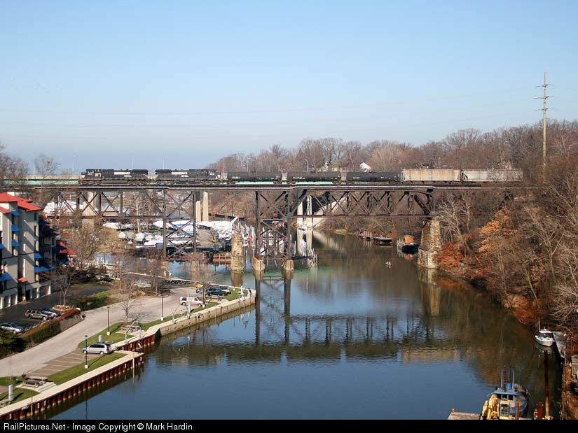 A short westbound with 8000 hp and five cars glides across Rocky River on the old Nickel Plate Mainline as a few people fish on this warm late November day.