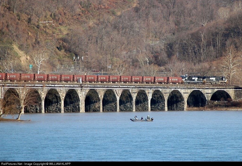 | Eastbound on Rockville bridge, with engine NS 9917, on ballest train with Herzog cars and fishermen in boat near bridge.