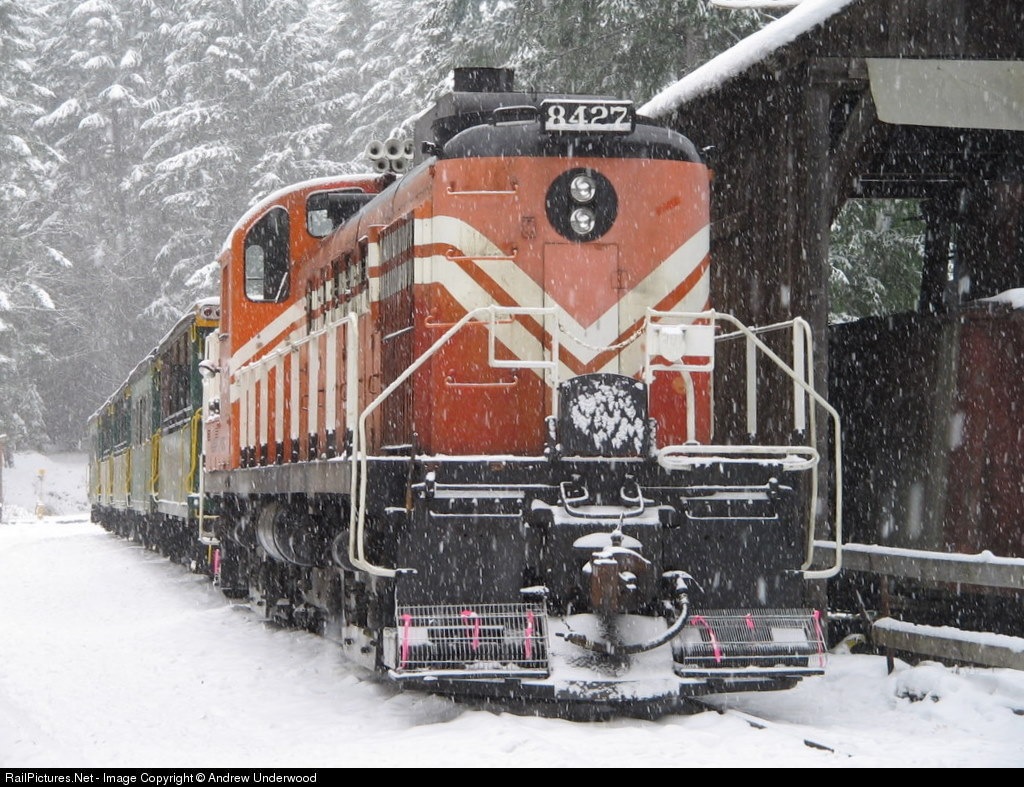 | Work Extra 8427 sitting at McLean Mills. This engine is currently being used by the Alberni Pacific Railway running excursions from Port Alberni to the Mill. Right now, it's being used to train BCIT Railway Conductor students. |