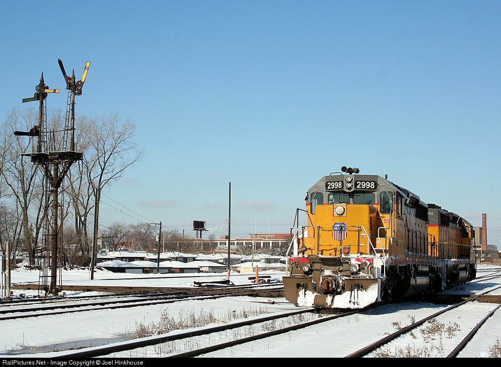 | UP 2998, a former C&NW SD40-2 (with a smiley face on the nose bell) and another UP SD40-2 are moving light through the Brighton Park Crossing. This crossing is still manned and uses semaphores. |
