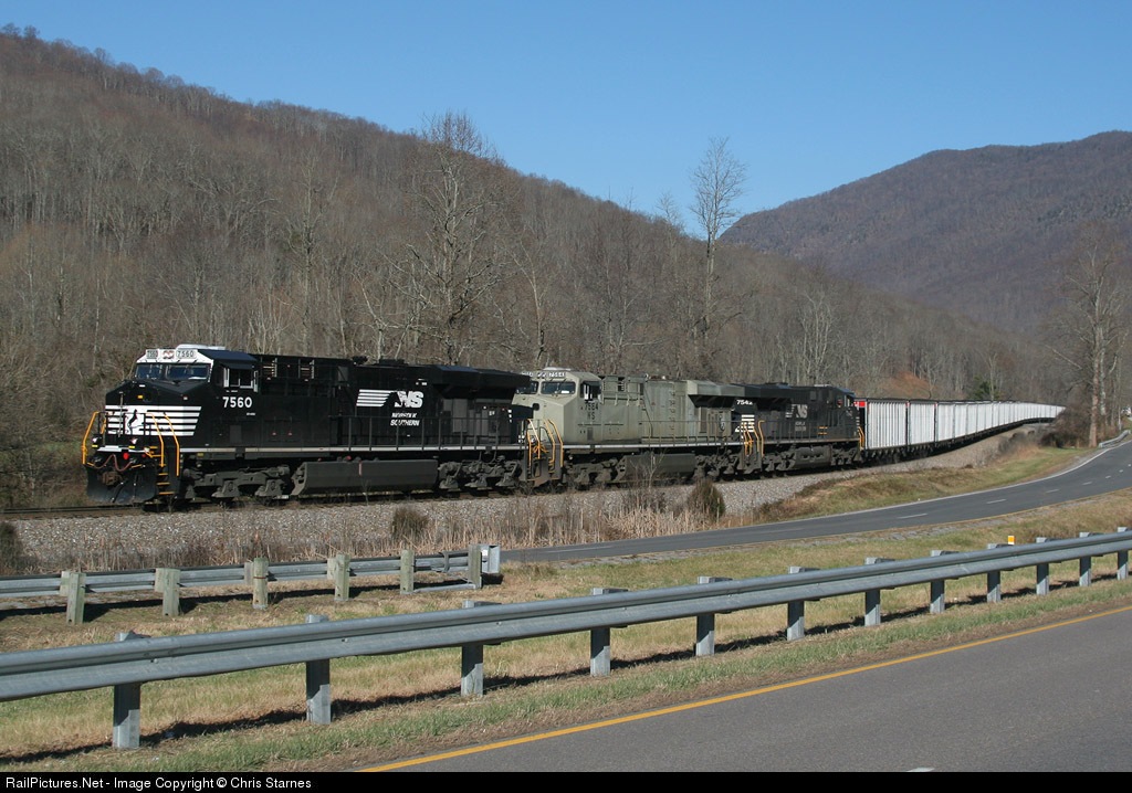 | NS 7560 leads two other GEVO units eastbound on loaded coal train 770 as it drifts along US Highway 23 through Duffield, VA at 10:50 a.m. This is a test train testing the use of distributed power units as helpers, as opposed to the manned pushers which operate over this line currently. Two additional ES40DCs along with a C40-9W were on the rear operating as DPU/remote helpers (a crew was on board to monitor their performance). From all radio conversations I heard, things were going very well. |