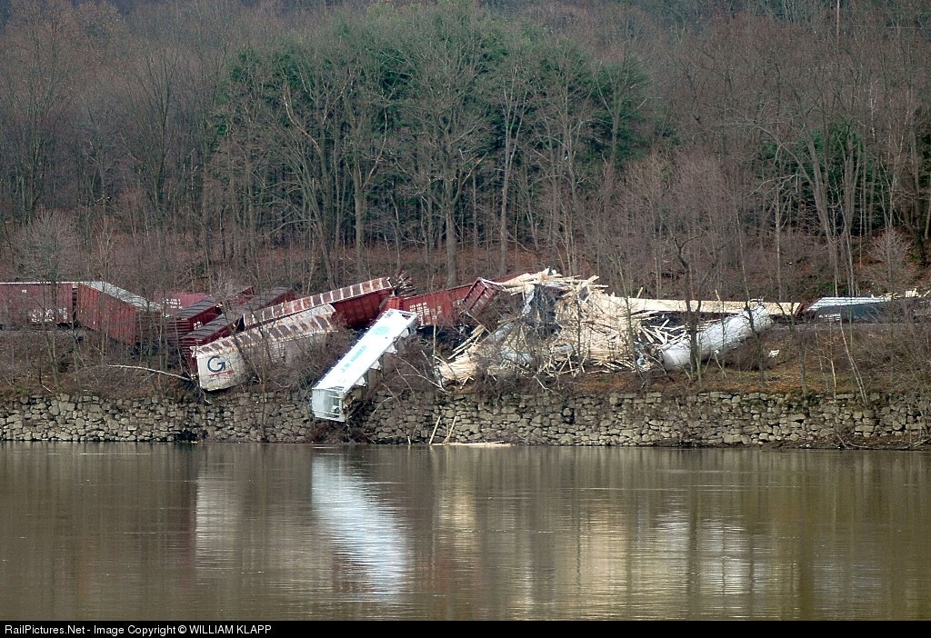 Derailment of southbound train looking across river, with at least 20 cars derailed. train derailed at about 1:00am thursday morning.