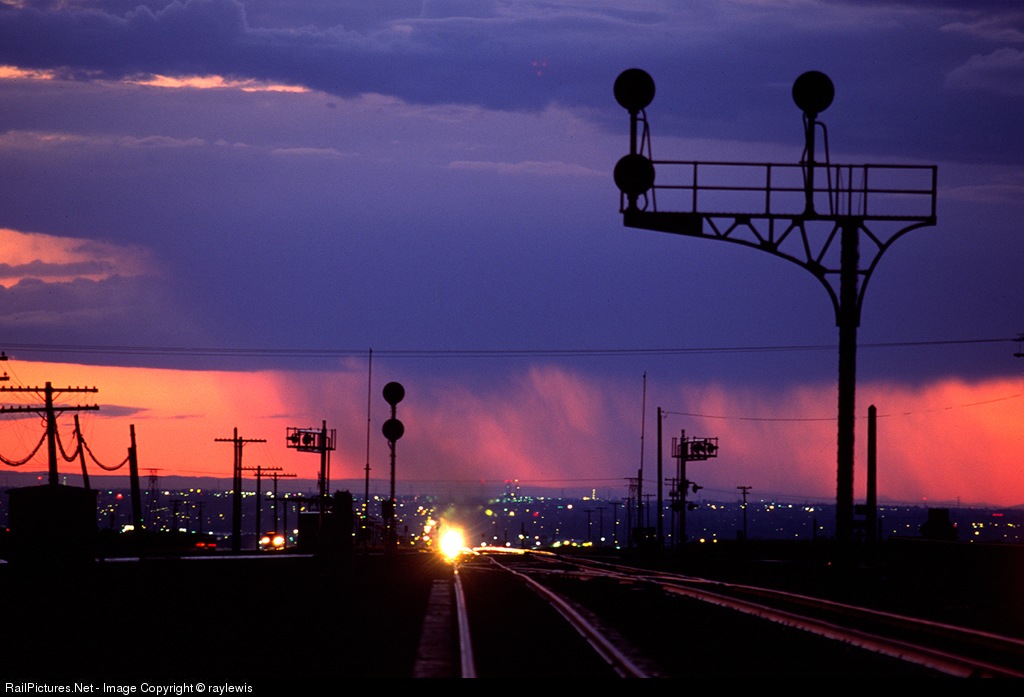 In the distant an eastbound UP train is seen approaching, while a downpour can be seen falling from a cloud in the red sky during sunset.