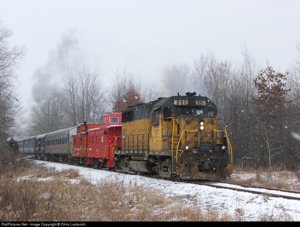 | TSBY was kind enough to offer up one of their own units to two the trainset back South to Owosso instead of PM 1225 shoving all the way home. Here we see TSBY 391 charging through a brief snow storm headed for Owosso. |