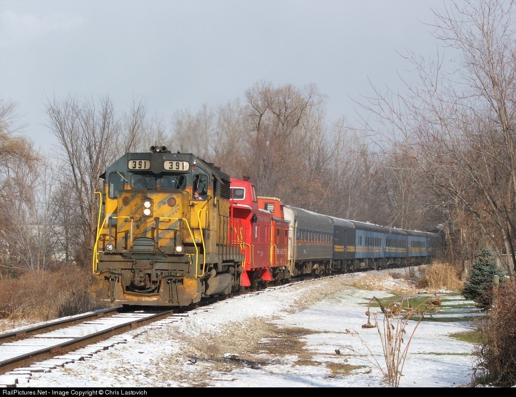 | Just 2 miles south of Chesaning, the skies trun from blizzard to sun shine as TSBY 391 rounds a curve with this years Santa train and the PM 1225 in tow. |