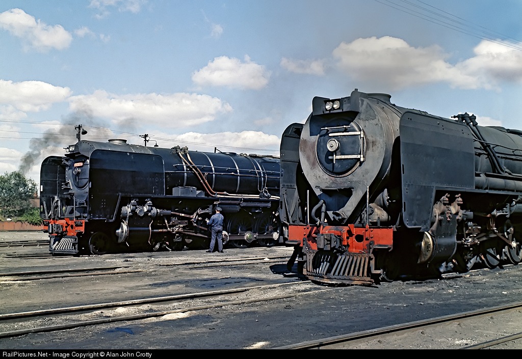 De Aar depot was a major steam shed for SAR, most of it's allocation was class 25 condenser locos and class 25 non condensers. This shot illustrates the front end differences between the two types of steam loco. The condenser is nearest the camera. The condensers could run for upto 600 miles without taking water, which made them ideal for the dry South African conditions. Only one condenser survives 3511, part of the national collection.