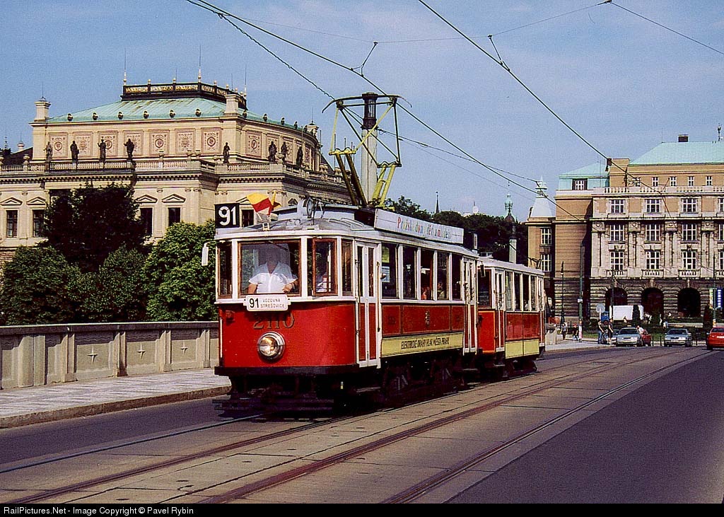 Historical line 91 on the Manesuv Bridge before philharmonic hall Rudolfinum in Prague (2110+1200 Ringhoffer)