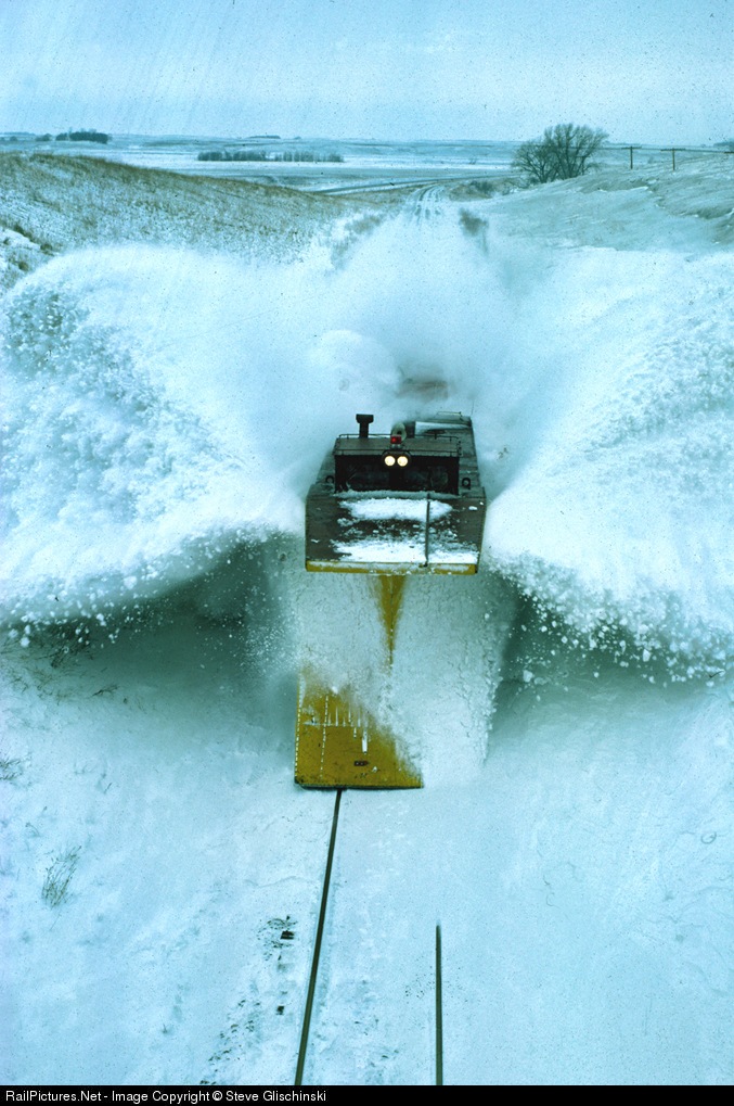 Look out! A plow extra with a GP9 pushing explodes into a cut near Barrett. This was one of three plow trains running on this day to Glenwood, MN - one from Minneapolis, one from Thief River Falls, and this one from Harvey, ND.