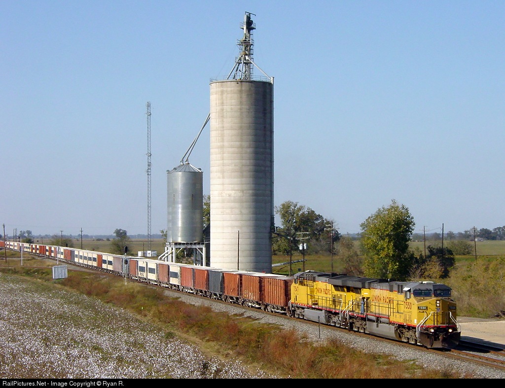 UP 7550 leads a second AC6000CW on an empty rock train, southbound through the diamond.