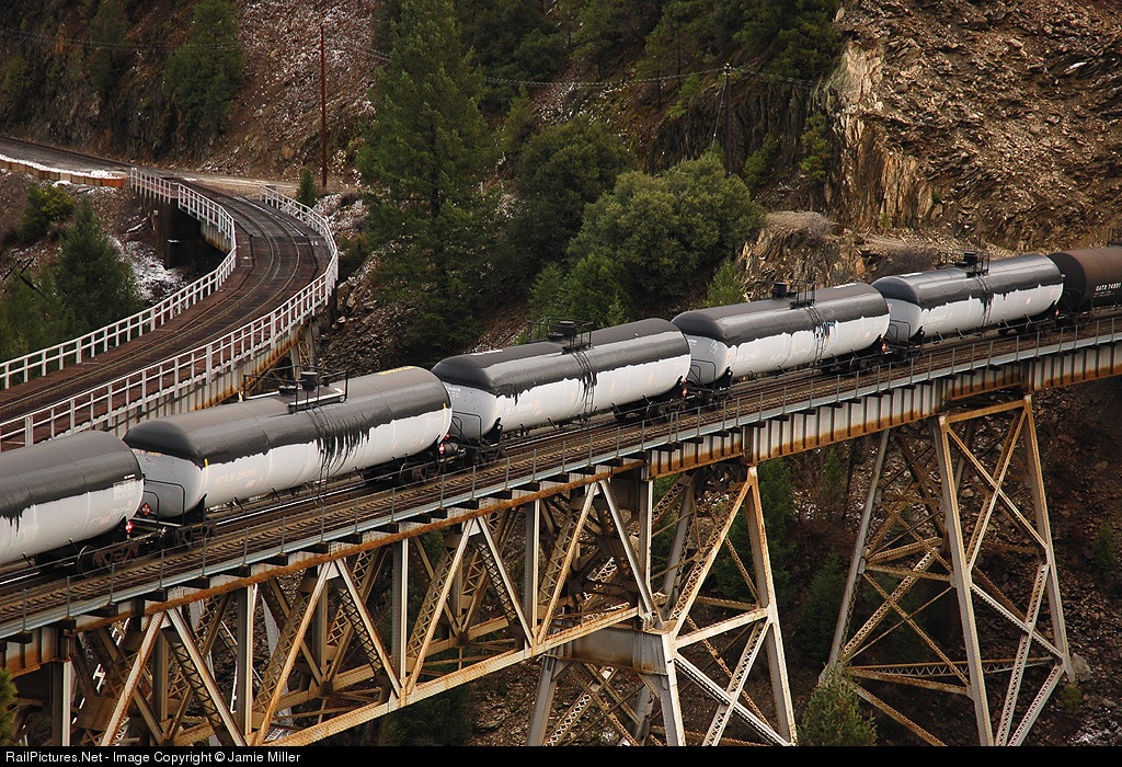 Thanks to some very cold weather, these LPG tank cars have a thick layer of ice on them. The height of the ice on the car, indicates the level of the load inside.