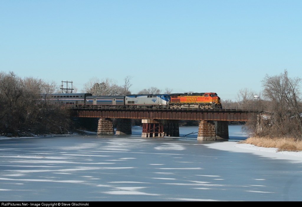 A late eastbound Empire Builder has a BNSF freight unit pinch hitting for an Amtrak unit crossing the Rum River in Anoka.