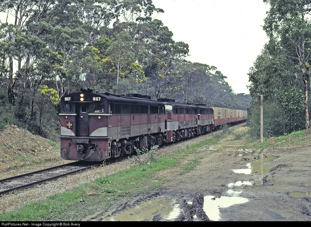 3 broad-gauge Alco-Goodwin '930 class' - double ended but with conventional styling at one end only - with an Adelaide bound container train. These were Alco's 'World' export models, but constructed in Australia. 957 is running 'blunt end first'.