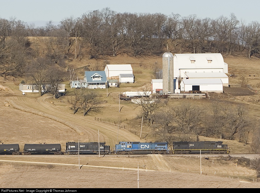 | Regular Merchandise Train from Waterloo, IA - Chicago, IL heads downhill from Peosta, IA towards Dubuque, IA. |