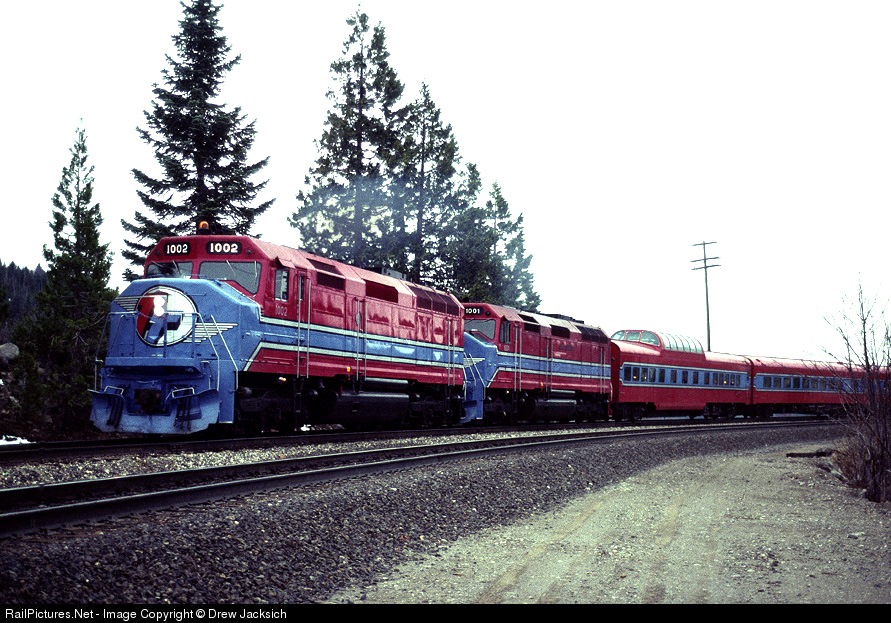 Considered by some to be the ugliest train to ever cross Donner Pass. the Sierra '49er Express replaced the fun train for the 1990-91 season. Transisco went bankrupt in April of '91. The locomotives are now on Montana Rail Link.