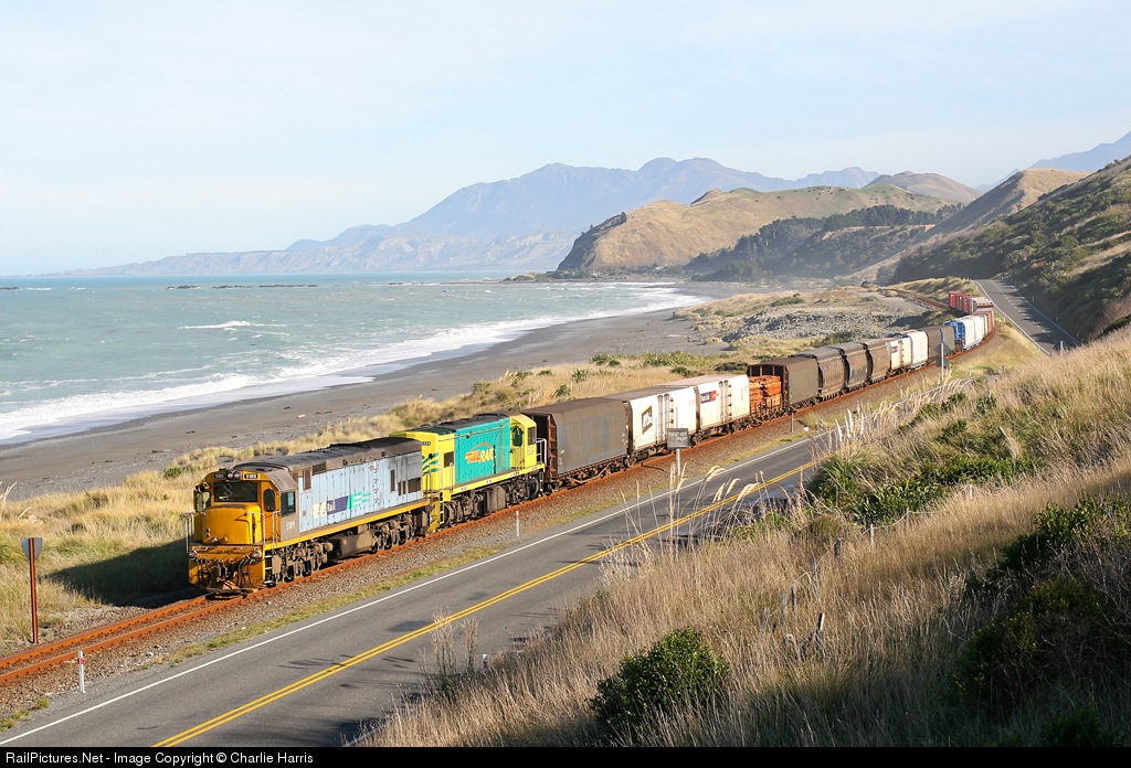 Trains on 3' 6" (1.067m) track from Whangarei to Bluff with virtually heritage rebuilt EMD and GE locomotives still the mainstay power. The network was privatized in 1990's and operated by Toll until 2008 when state owned KiwiRail was established.