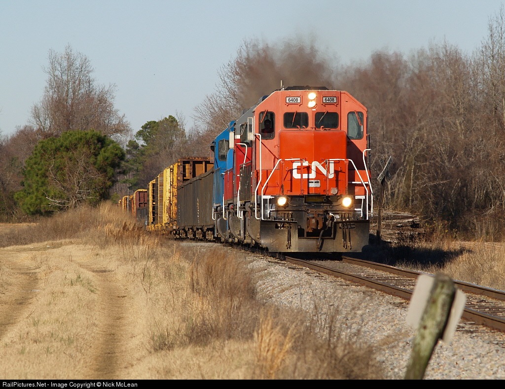 | A former CN geep, a long ways from home, accelerates across the fields of eastern NC. |