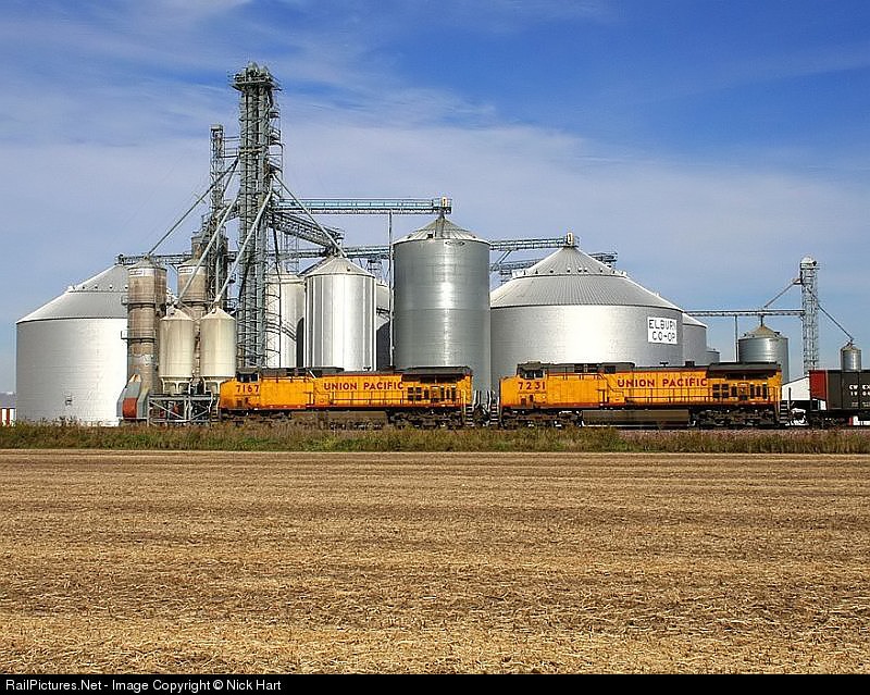 | UP 7167 and UP 7231, both AC4400CW's, lead a westbound emtpy coal train through Elburn, passing the Co-Op. |