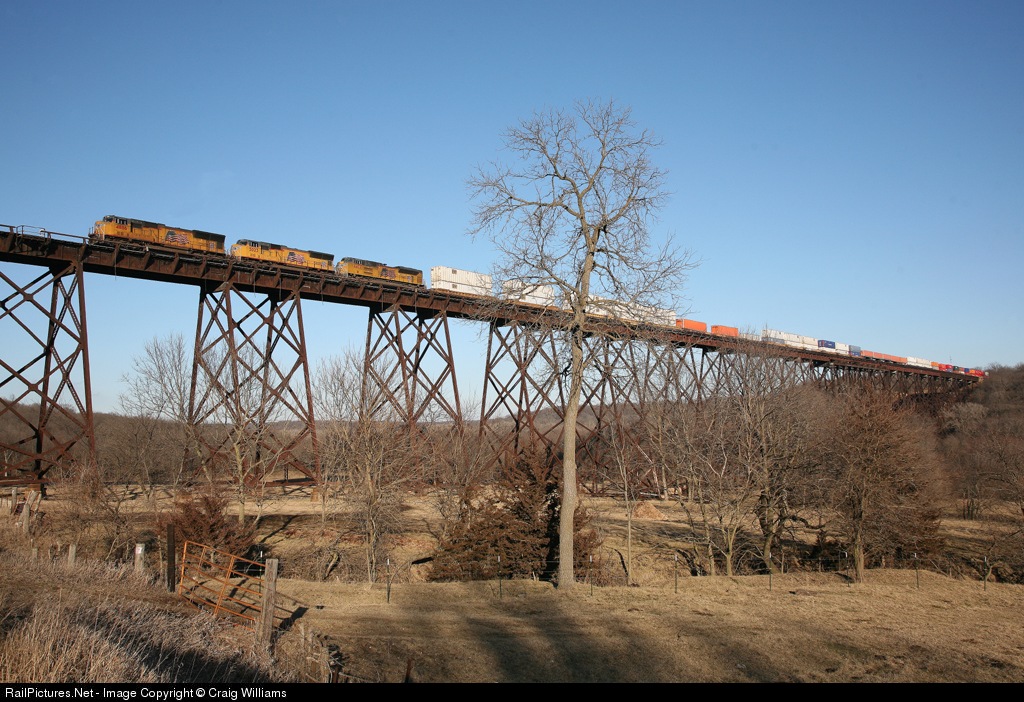 Westbound stack train crosses the 190 feet high Kate Shelly High Bridge. The Boone High Bridge was renamed to the Kate Shelly High Bridge in 1912 to honor a 15 year old girl that had saved the Midnight Express from a washed out bridge in 1881.