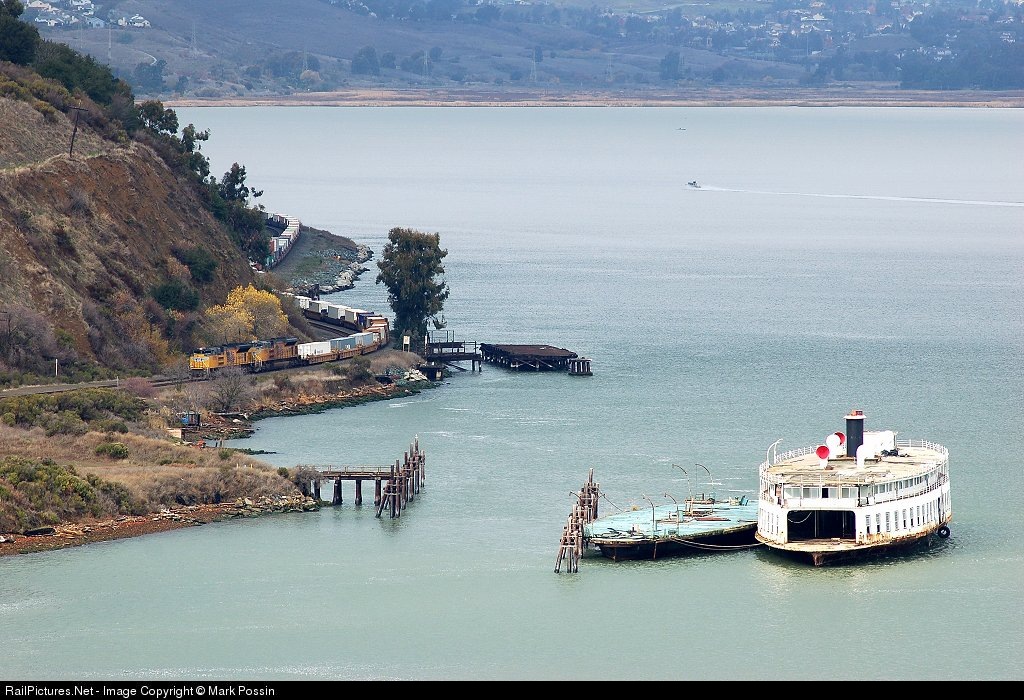 | A pair of new SD70ACe units power an eastbound along the Carquinez Straits, past a ferry hulk at the former Nevada Dock. |