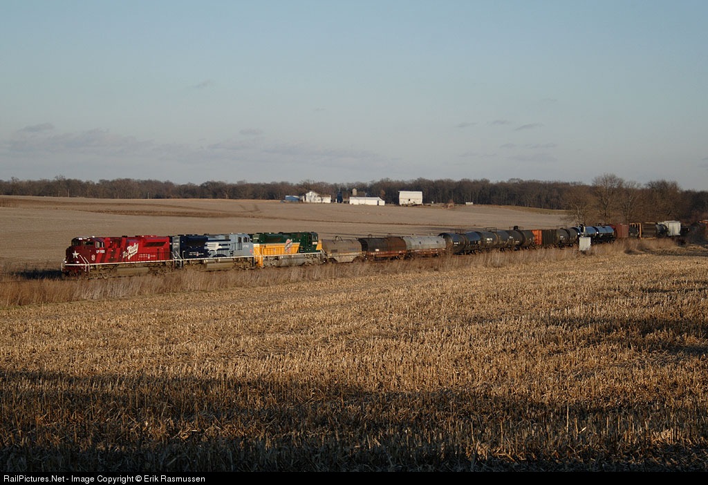 | The MKT, MP, and CNW Heritage units head west through the Illinois countryside with mixed manifest for Council Bluffs. |