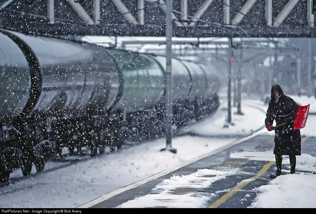 Station staff struggle to keep the platform clear of snow, as the daily Dalston-Grangemouth petroleum empties pass.