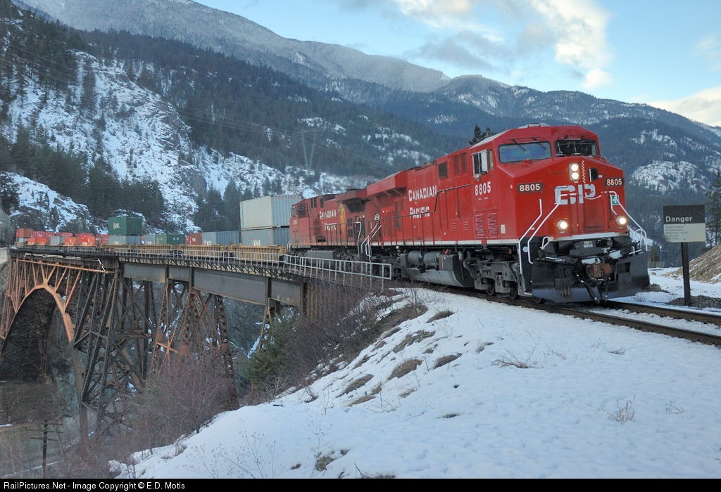| The bright red of 8805, coming off the CN Bridge at Cisco, is in sharp contrast to the darkening shadows in the Fraser Canyon. |
