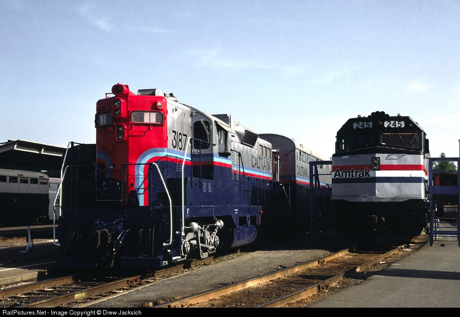 On display along with Amtrak F40 245, SP #3187 is wearing the colors suggested by the head of CalTrans, Adrianna Gianturco. The state was just taking over the commute operation although SP would operate it. Fortunatly, the geep and three gallery cars were the only equipment to ever wear this paint scheme