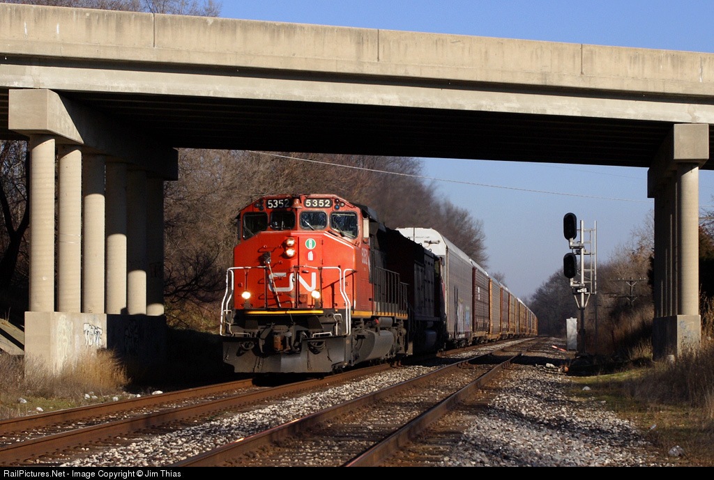 | CN 5352 peaks out from the shadows of the Fish Lake overpass as it splits the bridge supports on an unseasonably warm and fall-like day in late mid-December. Looks like someone forgot to put the broom away after sweeping off the front walkway. |