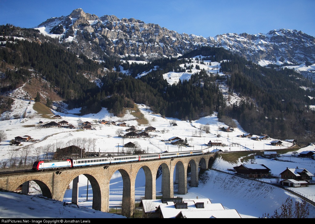 Cisalpino EC 132 is seen crossing the Frutigen Viaduct – 29/12/2006