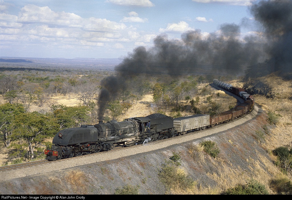 Ex Rhodesia Railways Beyer Garratt hauls a freight up and around the Zanguja horse shoe. The train conveys some coal for the Victoria Falls Hotel and international traffic for Zambia. Although the country may show in the index as Zambia it is in Zimbabwe.