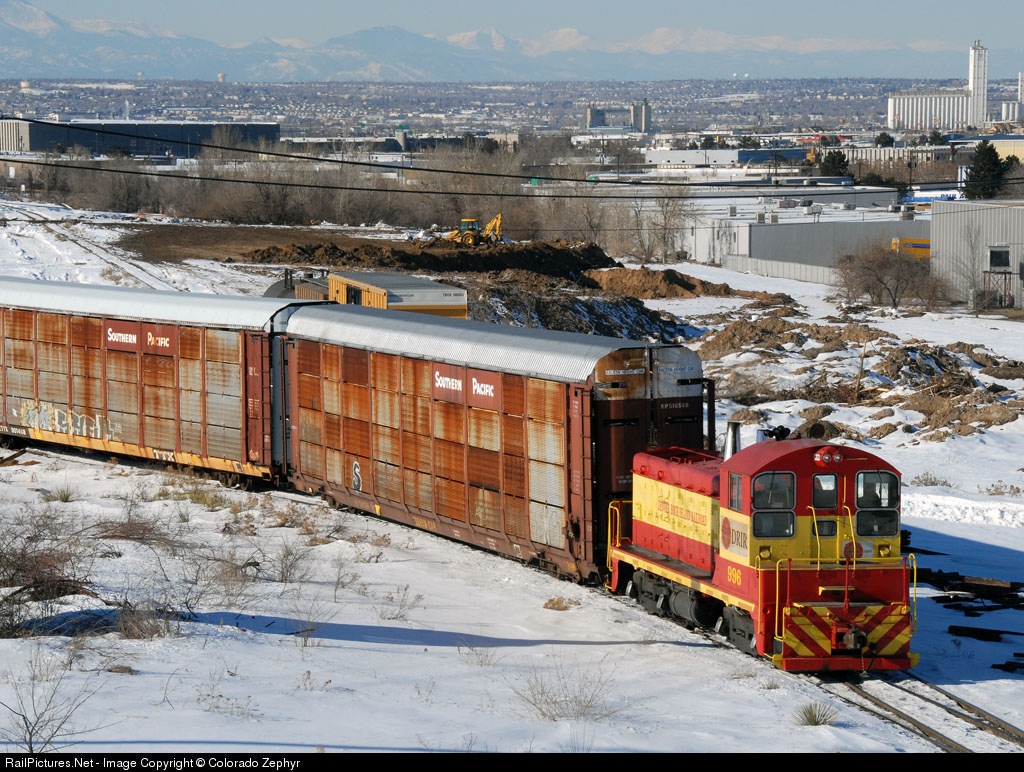| Only switcher in red and yellow - others now painted blue and silver. 996 works former Chicago, Rock Island & Pacific RR main now owned by Union Pacific. Line will be upgraded in coming years to handle UP unit coal trains to bypass UP Denver 36th Street Yard being sold to Denver Regional Transportation District for commuter rail yard and maintenance facilty. |