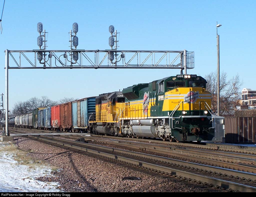 | UP SD70ACe 1995, the CNW heritage engine, leads MCBPR under the signal bridge at Elmhurst. |