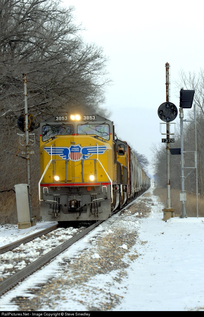 The Union Pacific M BNAS, the Bloomington - Alton Southern manifest, splits the position light signals at Funks Grove, Illinois on Tuesday Jan. 23, 2007. Replacement signals are in place between Bloomington and Springfield, Illinois. The position signals have been a part of the former Gulf, Mobile & Ohio line for many years, although many have fallen in the last two years with this short section remaining in service in Central Illinois.