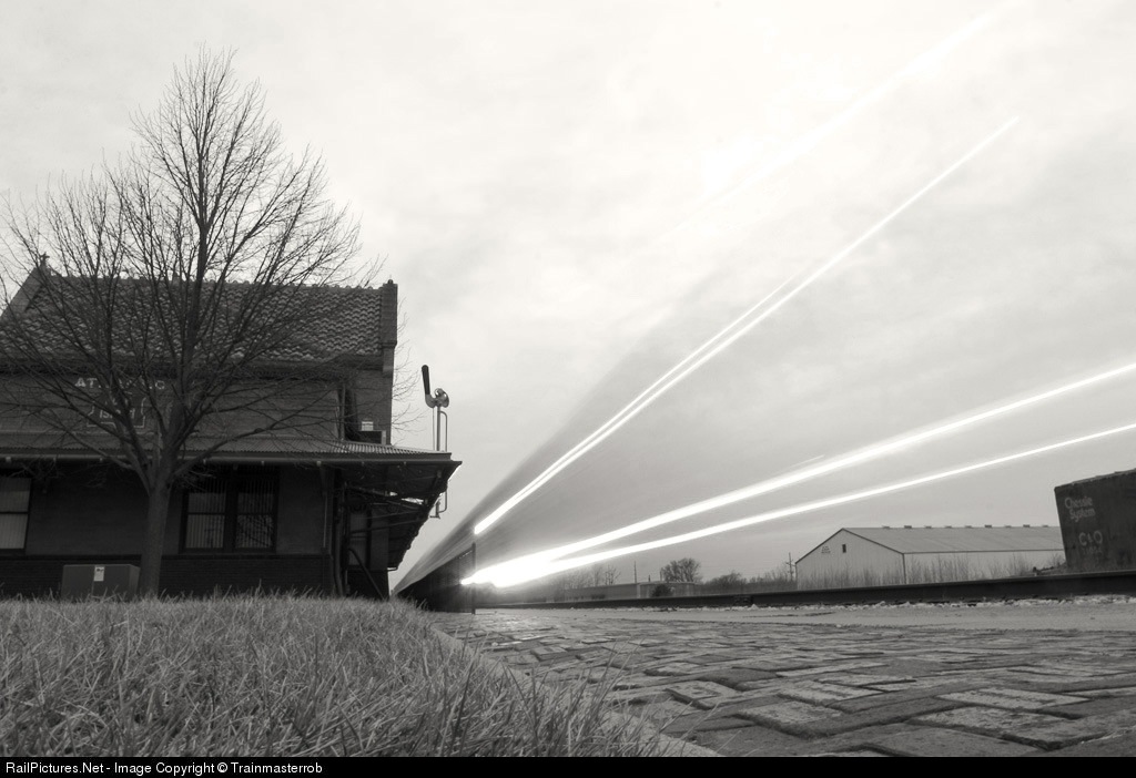 | In the predawn hours, the Iowa Democratic Party Special passes by the vintage Rock Island depot of Atlantic, Iowa. |