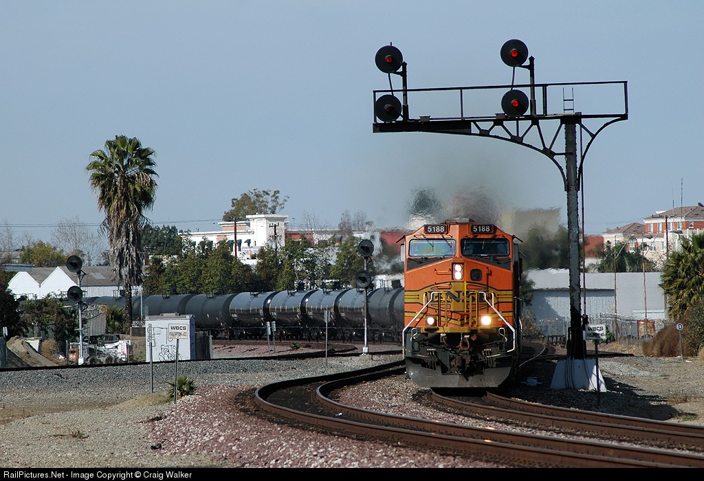 | BNSF 5188, 4341 and 4080 lead an eastbound empty ethanol train crosses to the north main at Fullerton Junction in southern California on January 28, 2007. |