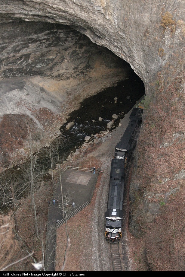 Eastbound NS loaded coal train 730 eases through the tight confines of Natural Tunnel at 15mph as it drops down one of the steeper grades on the Appalachia District. Several park visitors can be seen on the platform getting a closer look at the eastbound's trek through the tunnel.