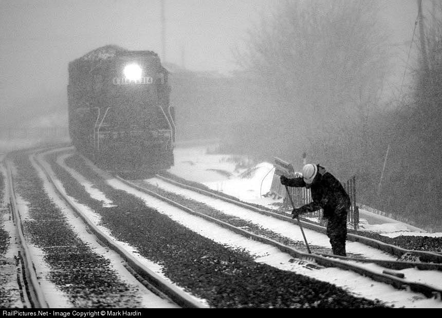 The W&LE coke train running "N&W" style holds the main as an NS maintainer clears the #5 switch on the "Indy" connection as old man winter keeps dumping snow on northeast Ohio.
