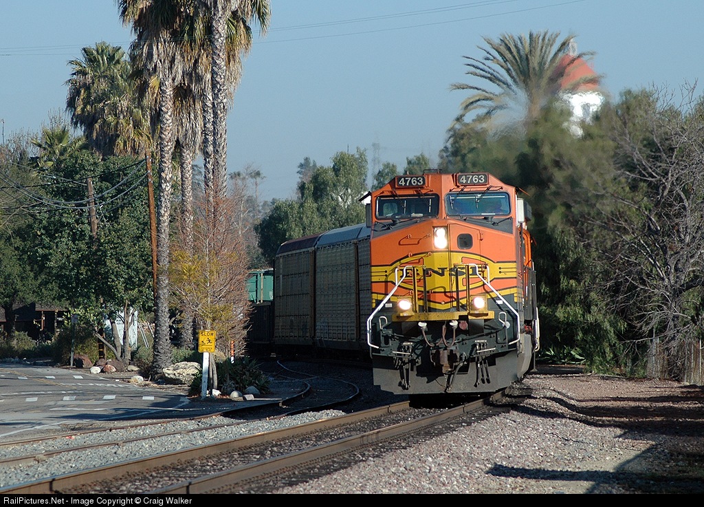 BNSF Dash 9-44CW 4763 leads a Barstow to San Diego freight past the historic Santa Fe station (the white dome above the autoracks, hidden in all the vegetation) in San Juan Capistrano, CA, on February 3, 2007. The consist is 4763, 2551, 5052 and 642, with 4188 bringing up the rear (DPU).