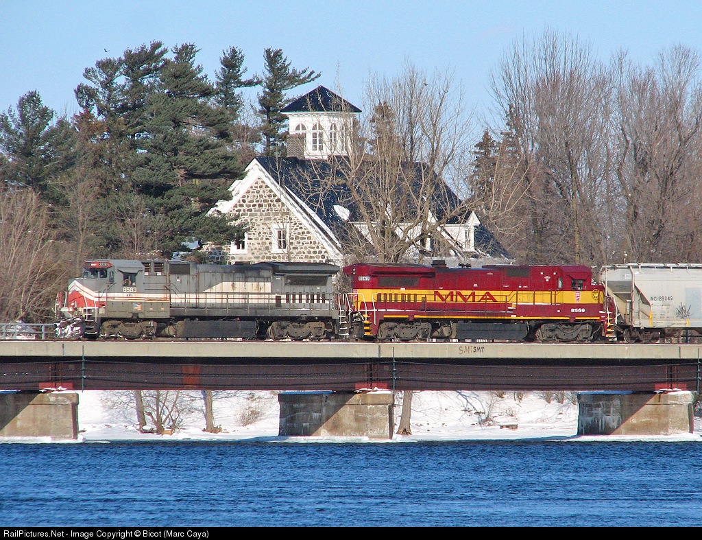 Crossing the Richelieu river with @180 axles. Trailing unit is MMA 8569. Half of the consist is empty propane tanks from Rainville propane near Farnham.